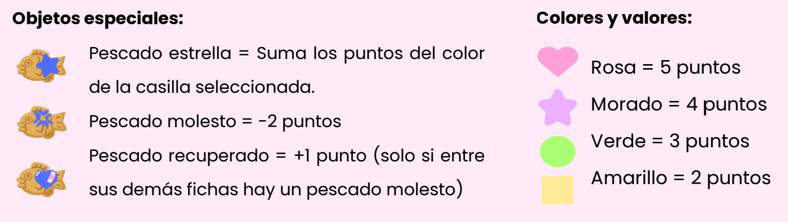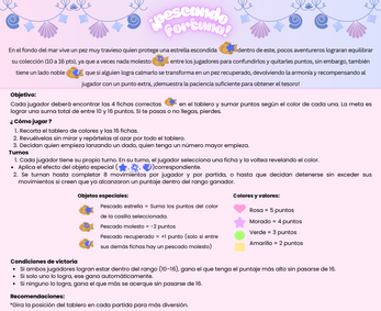 Antes de empezar lee las instrucciones detalladas ubicadas al reverso de la hoja, empieza recortando las 16 fichas de pescados en la parte inferior, repartelas al azar por todo el tablero y compitan entre ustedes para ver quien logra obtener más puntos .